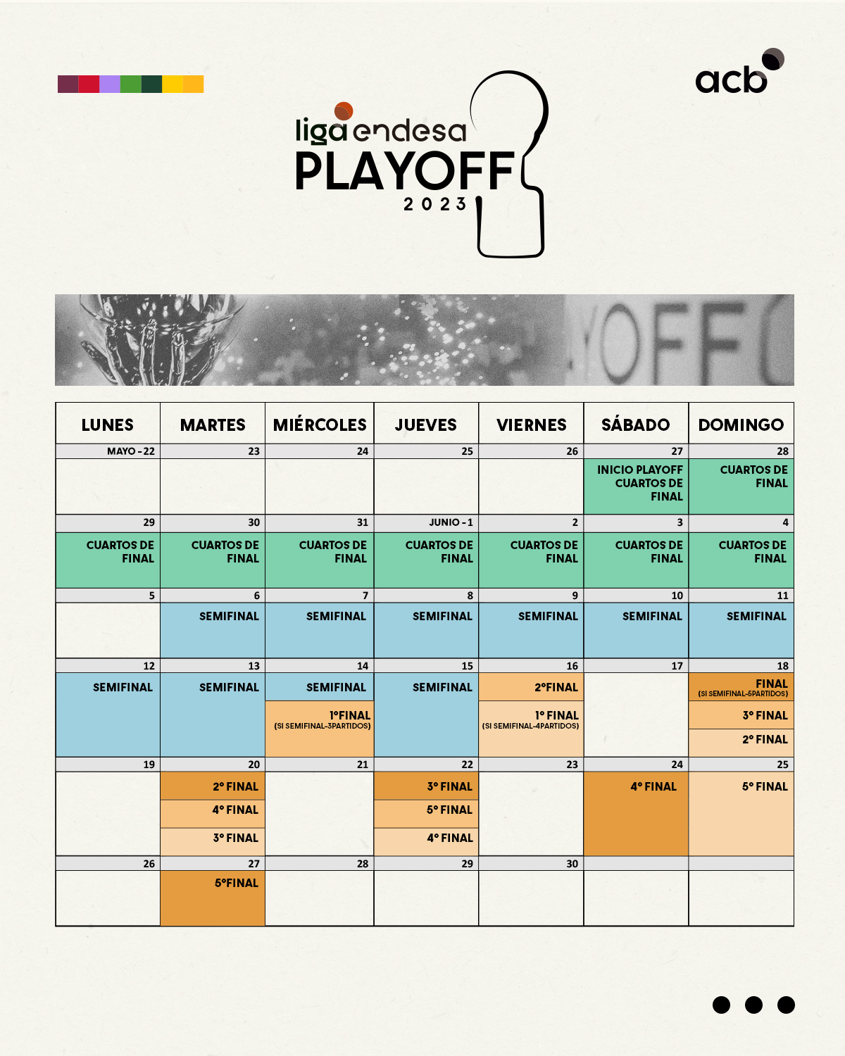 Comunicamos las fechas y horarios de los primeros y segundos partidos de los cuartos de final del Playoff Liga Endesa’23, a falta de confirmar los emparejamientos con la disputa de la Jornada 34 de la fase regular. Los terceros partidos tienen fecha asignadas, pero los horarios se decidirán más adelante.