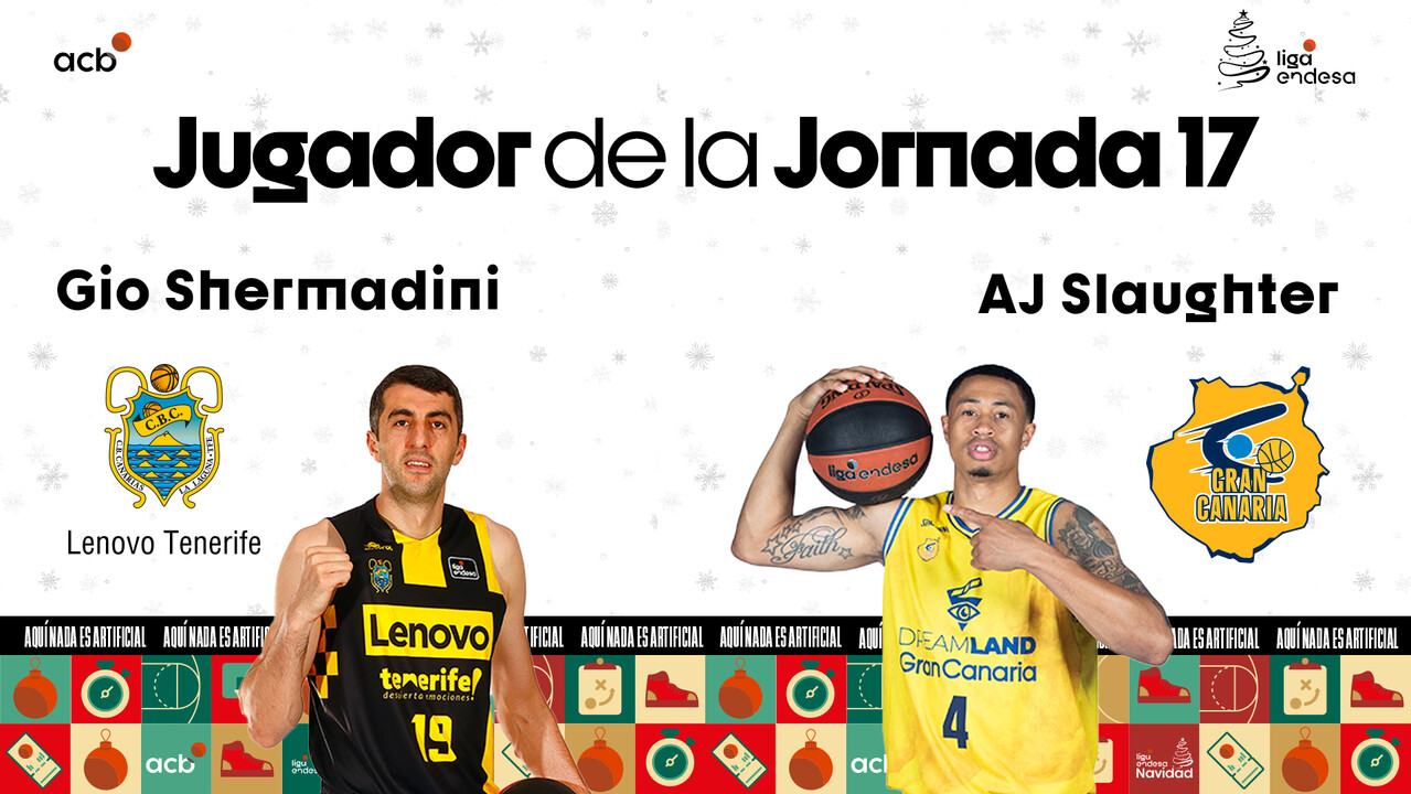 Con 32 de valoración, Giorgi Shermadini y AJ Slaughter comparten honores en la Jornada 17, proclamándose Jugadores de la Jornada. Es la 2ª para Slaughter… ¡ y la 19ª de Shermadini!