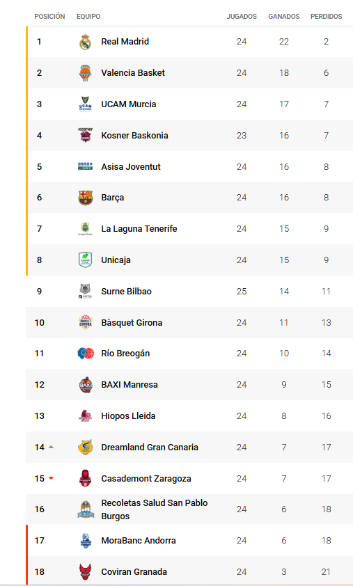 A los de Lakovic le ha venido bien las derrotas cosechadas en esta jornada por Casademont Zaragoza, San Pablo Burgos y Morabanc Andorra.