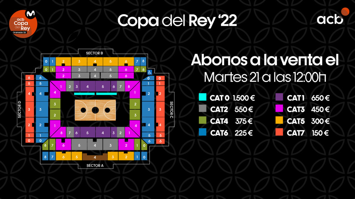 Este próximo martes 21 de diciembre a las 12:00 h saldrán a la venta los abonos para la Copa del Rey de Granada a través de acb.com. Los aficionados podrán vivir todo el espectáculo del evento desde 150 euros y con ocho categorías de precio disponibles