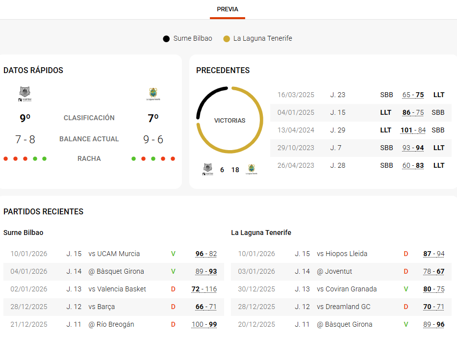 En la última visita de LA LAGUNA TENERIFE a Bilbao la victoria sonrió al plantel tinerfeño (65-75), con parciales de 13-20, 19-21, 19-19 y 14-15).