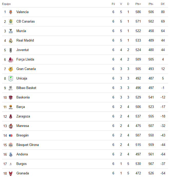 Es primero el conjunto del «Roig Arena» merced a su +80 (diferencia favor-contra), seguido por el CB Canarias (+69), UCAM Murcia (+64) y Real Madrid (+44).