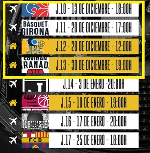 La Laguna Tenerife asegurará su presencia en la Copa del Rey sumando cuatro victorias. Y si es derrotado en algunas de estas citas, en el mes de enero le quedarán opciones de sumar: Joventut de Badalona (14ª jornada; fuera), Lleida (15ª jornada; dentro), Bilbao Basket (16ª jornada; fuera) y Barça (17ª jornada; fuera).