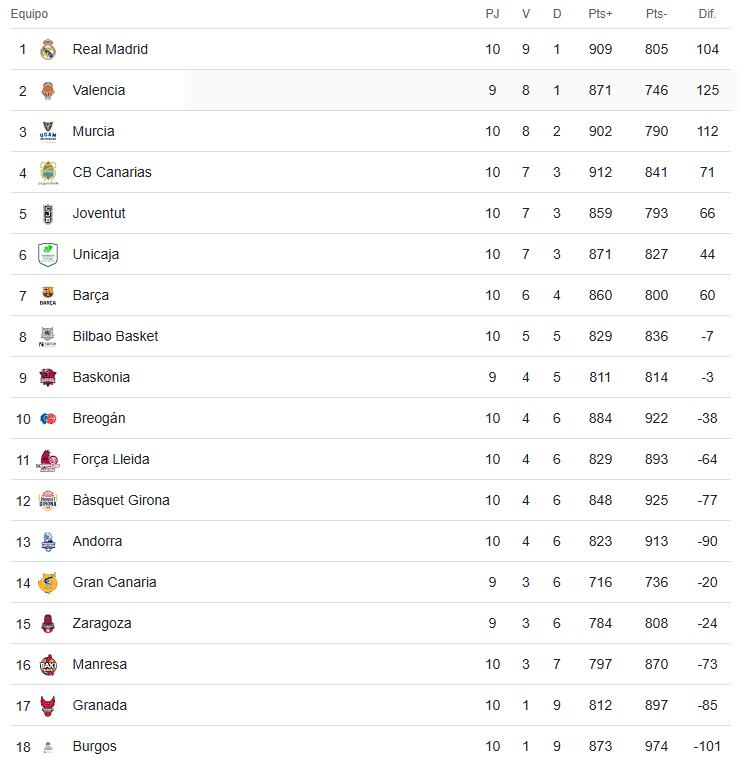 Es cuarto a día de hoy merced a la victoria de UCAM Murcia sobre el conjunto de Badalona, al que los aurinegros aventajan en diferencia favor-contra 71 a 66, mientras que los del «Martín Carpena», que sufrieron para doblegar al colista Burgos, figuran con +44.