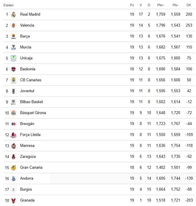 Barça, que hoy ganó por un apretado 97 a 92 al Girona, comparte la tercera plaza con UCAM Murcia y Unicaja, victoriosos también en la jornada 19ª, con el balance de 13-6.