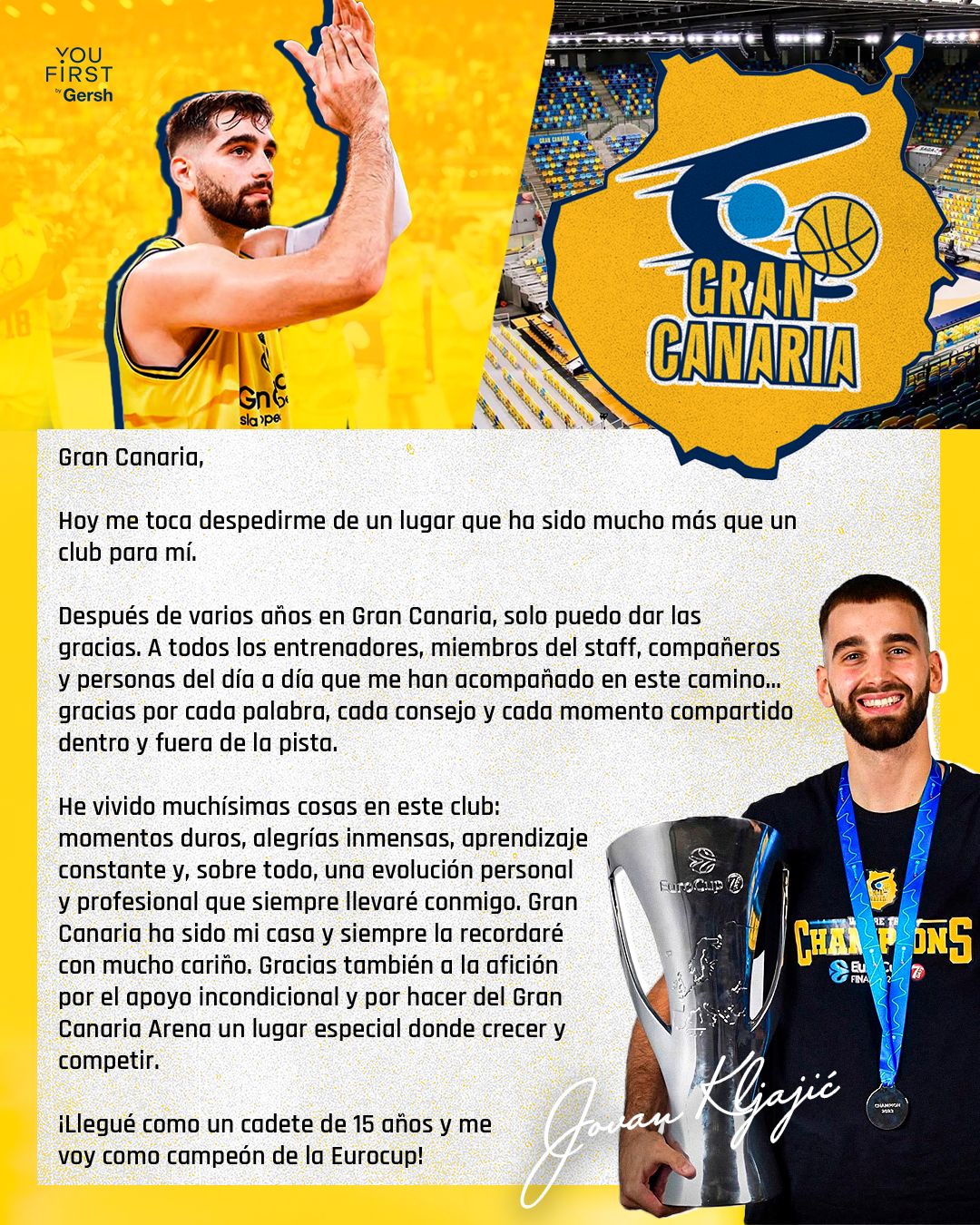 El Club Baloncesto Gran Canaria le desea la mayor de las suertes en su futuro personal y profesional, al mismo tiempo que le agradece el trabajo, la constancia, y la perseverancia mostrada desde su llegada a la isla con 15 años, hasta la actualidad.