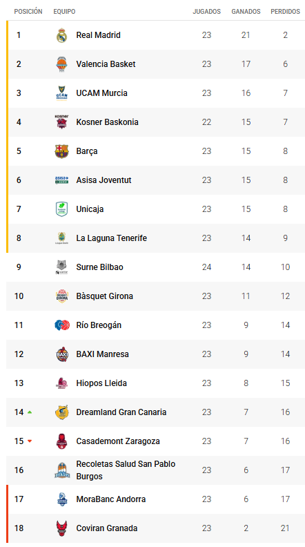 Los de Lakovic son décimo cuartos, con 7 triunfos y 16 derrotas, mismo balance de Zaragoza, teniendo por debajo a San Pablo Burgos y Andorra, ambos con un 6-17.