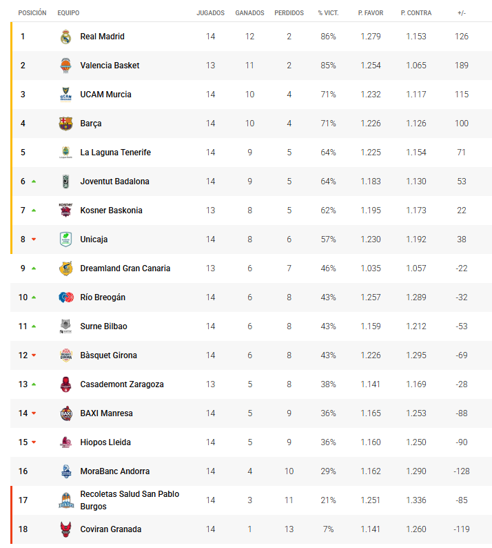 Los mejores situados son UCAM Murcia y Barça, ambos con 10-4, siendo sus principales rivales La Laguna Tenerife, Joventut de Badalona, Baskonia y Unicaja.
