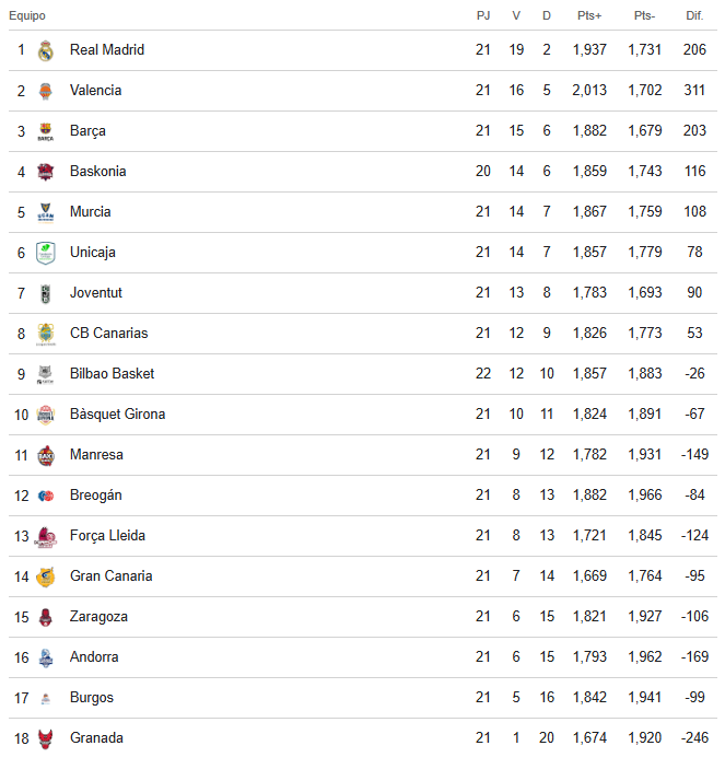 De los ocho primeros perdieron en esta jornada UCAM Murcia, en su visita al Valencia Basket, y La Laguna Tenerife, que cayó en el «Nou Congost».