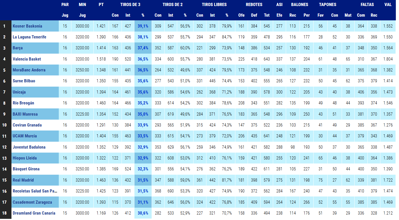 Los del «Buesa Arena» acumulan 167 triples de 427 lanzamientos, por los 166 de 436 de la escuadra del «Santiago Martín».