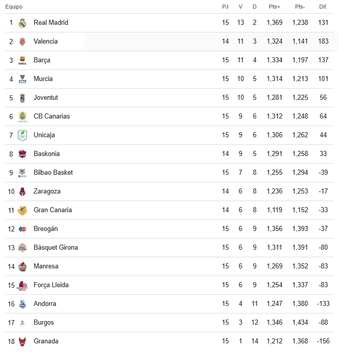 La diferencia con el noveno clasificado, Bilbao Basket, es de dos triunfos y solo que los de Ponsarnau ganen sus dos partidos ante Canarias y Coviran Granada por «palizas» no superarán a los tres que están en positivo. El +- de los vascos es de -39.