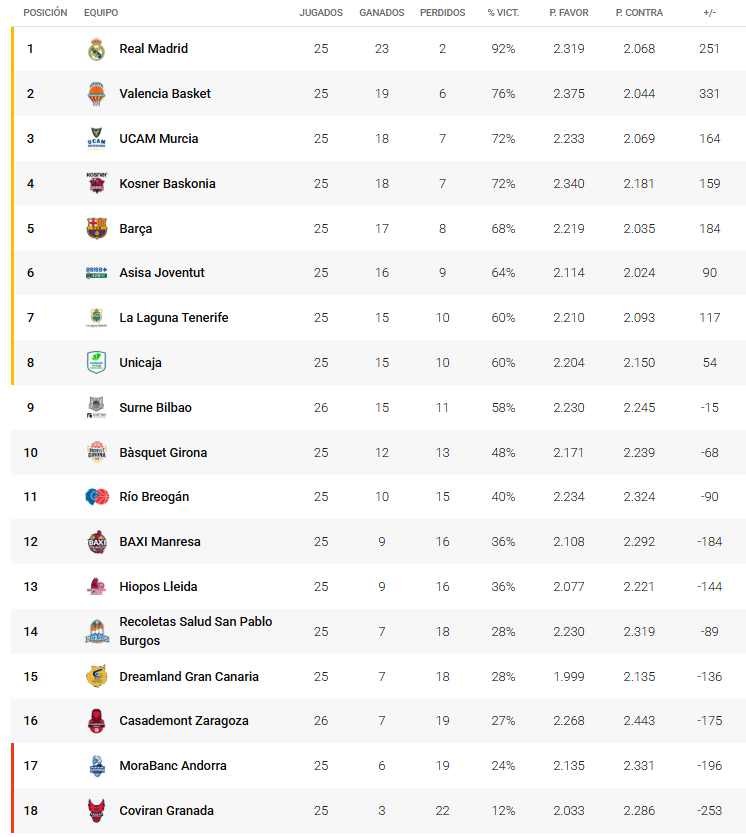 Los cinco de arriba, léase Real Madrid, Valencia Basket, UCAM Murcia, Baskonia y Barça, saldaron con éxitos sus partidos.