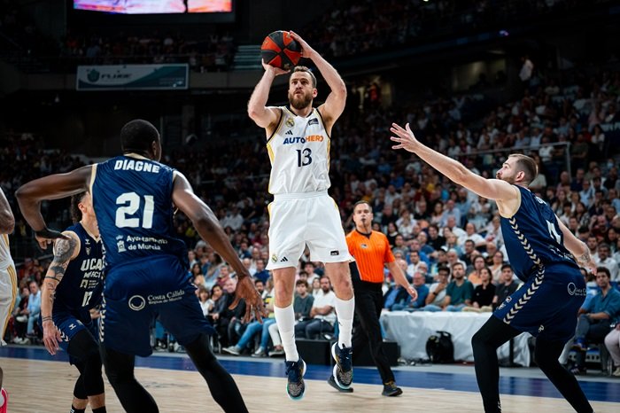 El conjunto blanco dominó desde el principio y supero a un combativo UCAM Murcia que creyó en la victoria hasta el final. La dirección de Campazzo (11 puntos y 7 asistencias) y la efectividad de Musa (16 puntos), claves en la victoria del Real Madrid