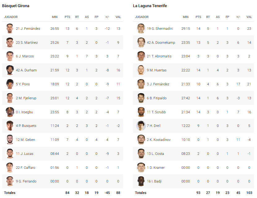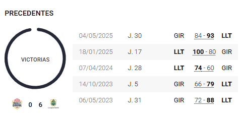 El último partido jugado en cancha catalana fue el 4 de mayo de 2025, que deparó el resultado de 84-93. Los puntos de aquel choque se repartieron así: