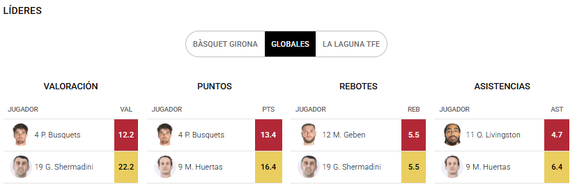 El MVP del Girona Basket es el español Pep Busquets, con +122, seguido por el +112 de Livingston y el +111 de Fernández.