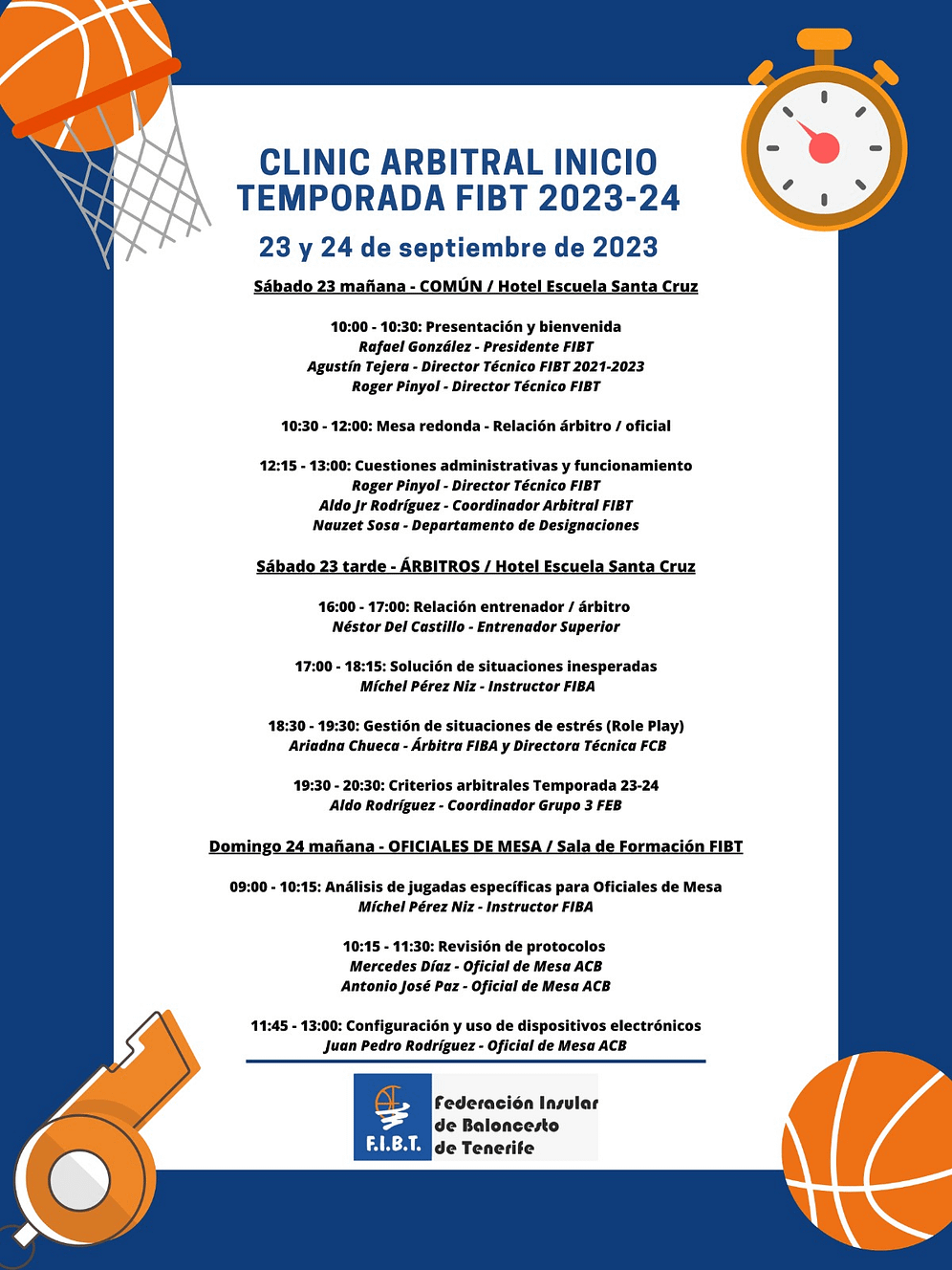 A lo largo de los dos días intervendrán Aldo Rodríguez Jr. (coordinador arbitral FIBT), Nauzet Sosa (Departamento de Designaciones), el entrenador Néstor del Castillo, el instructor FIBA Michel Pérez Niz, Ariadna Chueca (directora técnica FCB y árbitro FIBA), Aldo Rodríguez (coordinador Grupo 3 FEB), además de intervenir oficiales de mesa ACB.