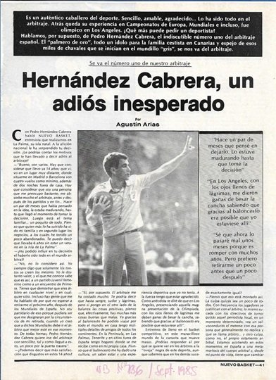 JORGE GONZÁLEZ cuelga hoy en Facebook una página de la prestigiosa y ya desaparecida revista de baloncesto llamada NUEVO BASKET, que fue un referente periodístico en la década de los ochenta, en la que entrevisto a HERNÁNDEZ CABRERA con motivo de su inesperada decisión de «colgar el silbato» como árbitro nacional e internacional.