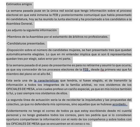 Este es el escrito que quiere hacer llegar a árbitros y oficiales de mesa no profesionales de cara a las elecciones federativas: