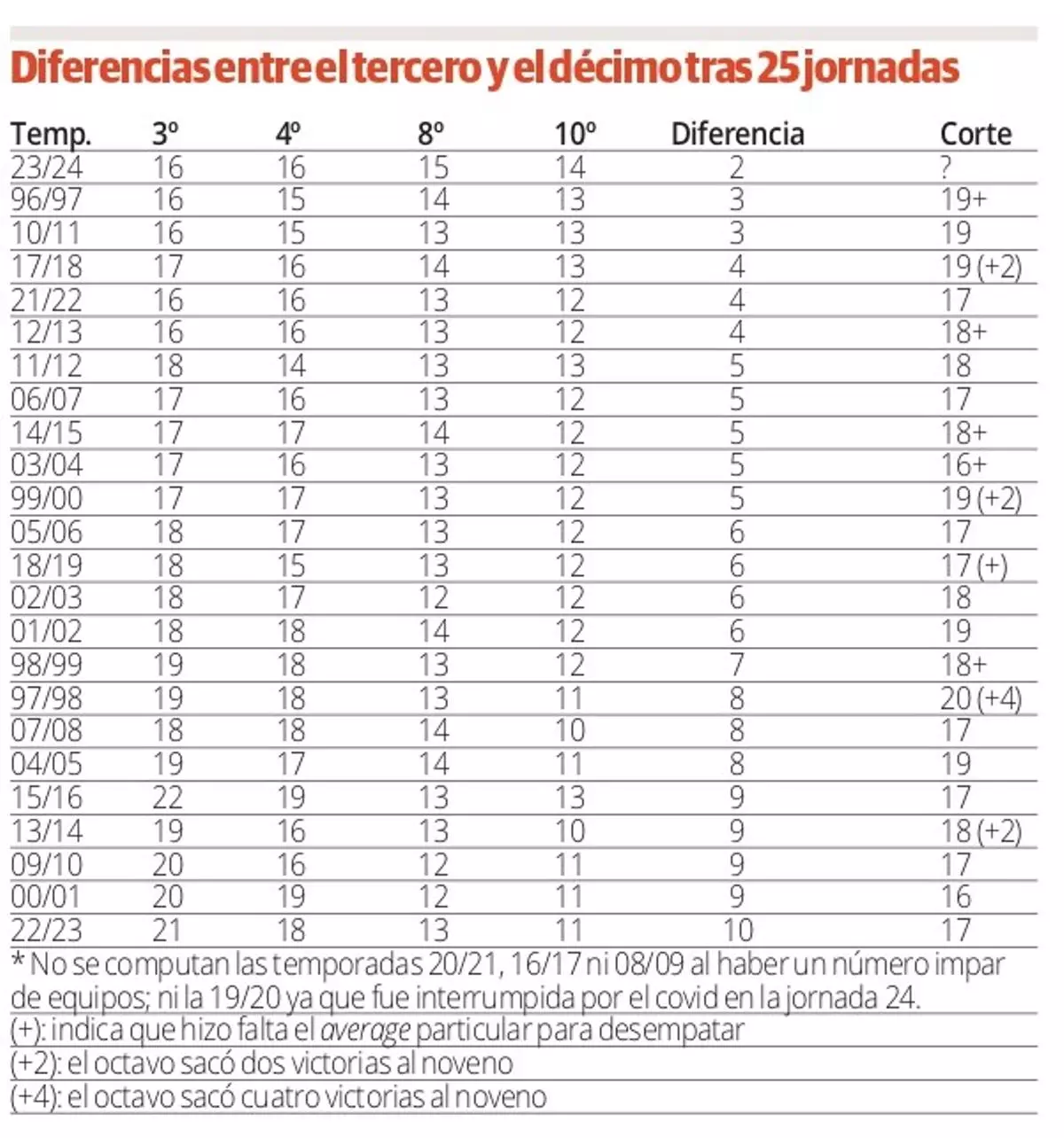 Pero donde no hay casos previos es en la marca de corte, ya que nunca un octavo clasificado había sumado ya 15 éxitos a falta de nueve jornadas para el término de la liga regular. Como tampoco ningún décimo en la tabla pudo alcanzar los 14 resultados positivos y solo 11 derrotas, todo con el añadido de sacar cuatro partidos de ventaja al undécimo, puesto en el que igualan Bilbao, Zaragoza y Girona.