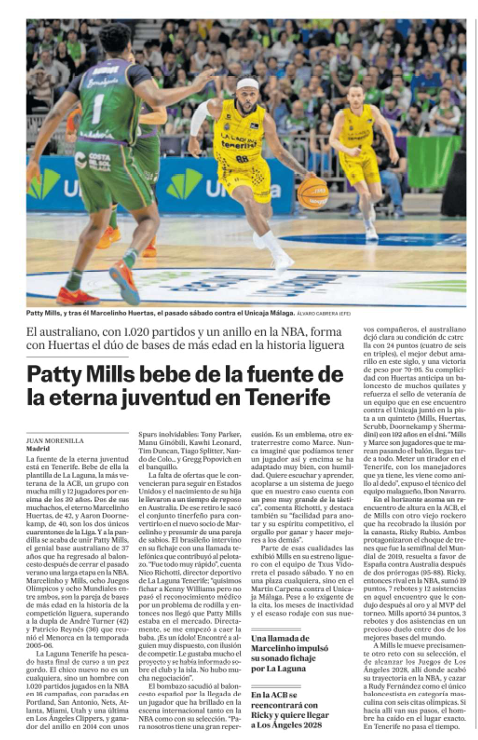«La fuente de la eterna juventud está en Tenerife. Bebe de ella la plantilla de La Laguna, la más veterana de la ACB, un grupo con mucha mili y 12 jugadores por encima de los 30 años. Dos de sus muchachos, el eterno Marcelinho Huertas, de 42, y Aaron Doornekamp, de 40, son los dos únicos cuarentones de la Liga. Y a la pandilla se acaba de unir Patty Mills».