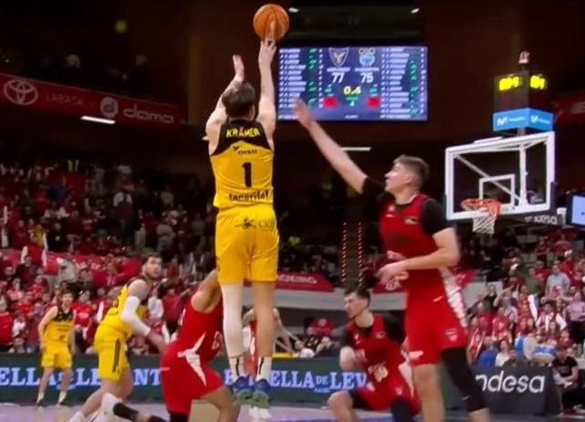 Vidorreta, nuestro entrenador, pide un tiempo muerto y esta vez «la comedia» la dirige Marcelinho Huertas. Se saca de un lateral en el terreno de los murcianos, se cruza Krämer tras unas rápidas fintas, se levanta, tira a la desesperada y ¡triplazo! espectacular sobre la bocina.