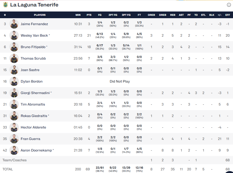 Afortunadamente para los intereses canaristas el Nymburk estaba muy mal desde el 6,75, con 1 de 10 tiros; por el 2 de 8 de La Laguna Tenerife.