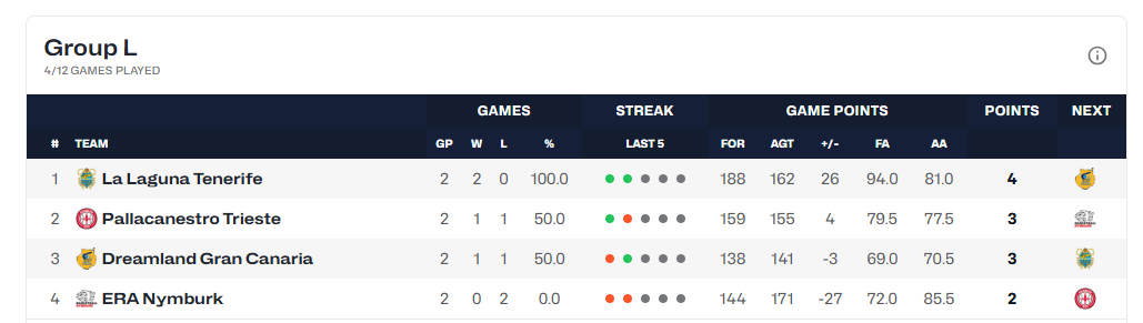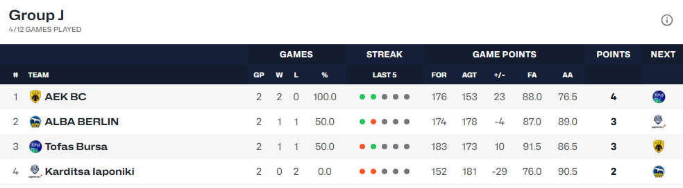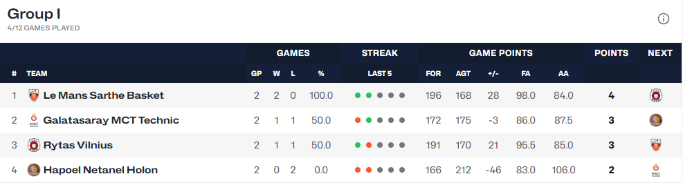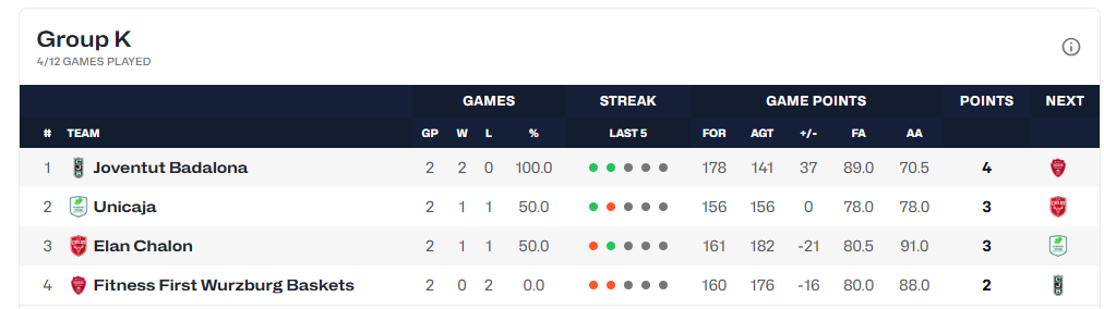 Le Mans Sarthe Basket (Grupo I), AEK BC (Grupo J), Joventut de Badalona (Grupo K) y La Laguna Tenerife (Grupo L), son los invictos del Top’16 tras disputarse la segunda jornada.