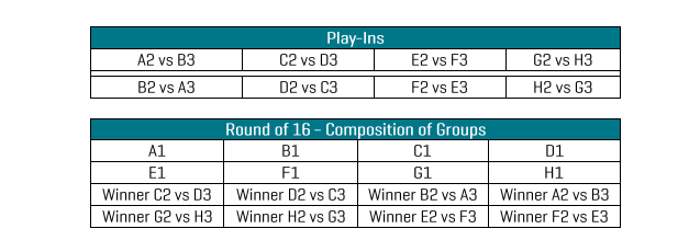 Los clasificados en la segunda y tercera posiciones de cada uno de los ocho grupos se jugarán en una eliminatoria el acceso a la siguiente fase, donde les esperarán los ocho campeones.