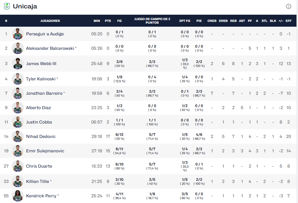 Tanto Emir Sulejmanovic (15 puntos y 3 rebotes) como Nihad Dedovic (17 puntos y 7 rebotes) no solo fueron prolíficos, sino también constantes durante toda la noche para Unicaja.