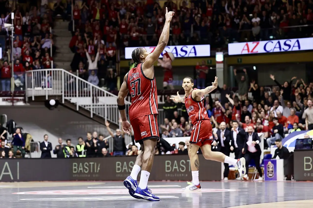 Buie se prepara para la volcada de Vincini y luego anota desde más allá del arco para poner a Sassari cinco puntos arriba. Candussi anota con una falta con asistencia de Ross y completa la jugada de tres puntos, y Ceron anota otra jugada de larga distancia sobre la bocina.