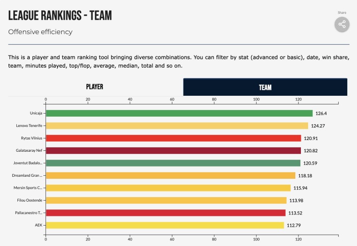 El hecho de que Rytas Vilnius haya quedado en tercer lugar con una tasa de 121 puntos cada 100 puntos, quizás resalta por qué muchos sugieren que este equipo de Rytas podría ser el que finalmente logre abrirse camino hasta la Final Four.