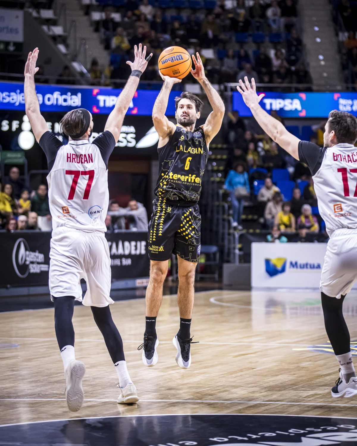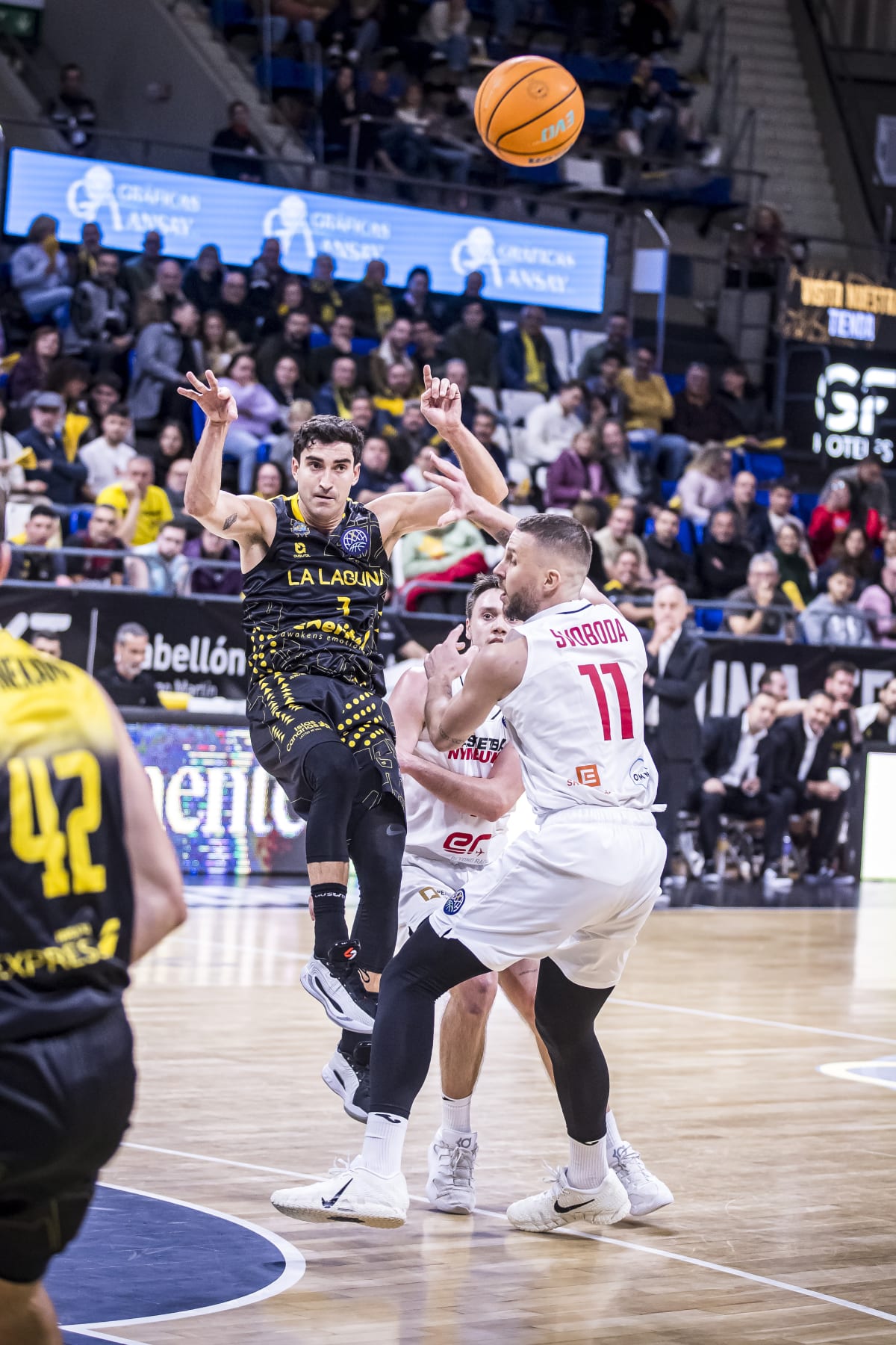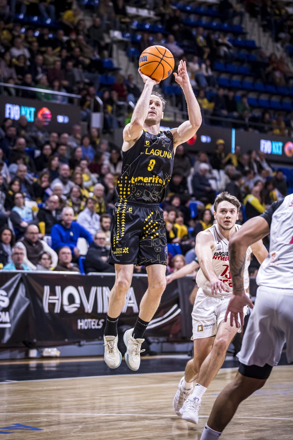 Incidencias: Primer partido de la segunda fase de la Liga de Campeones FIBA, disputado en el pabellón de Deportes Santiago Martín, ante algo más de dos mil personas. Antes de iniciarse el encuentro, los capitanes de La Laguna Tenerife, Marcelinho Huertas, Gio Shermadini y Aaron Doornekamp pusieron un ramo de flores en el asiento de Felipe Hernández Gil «Pipo», directivo de la Peña San Benito, fallecido este lunes, a la edad de 66 años. Se guardó un minuto de silencio por los fallecidos en el accidente ferroviario de Córdoba.