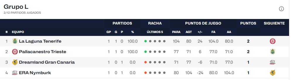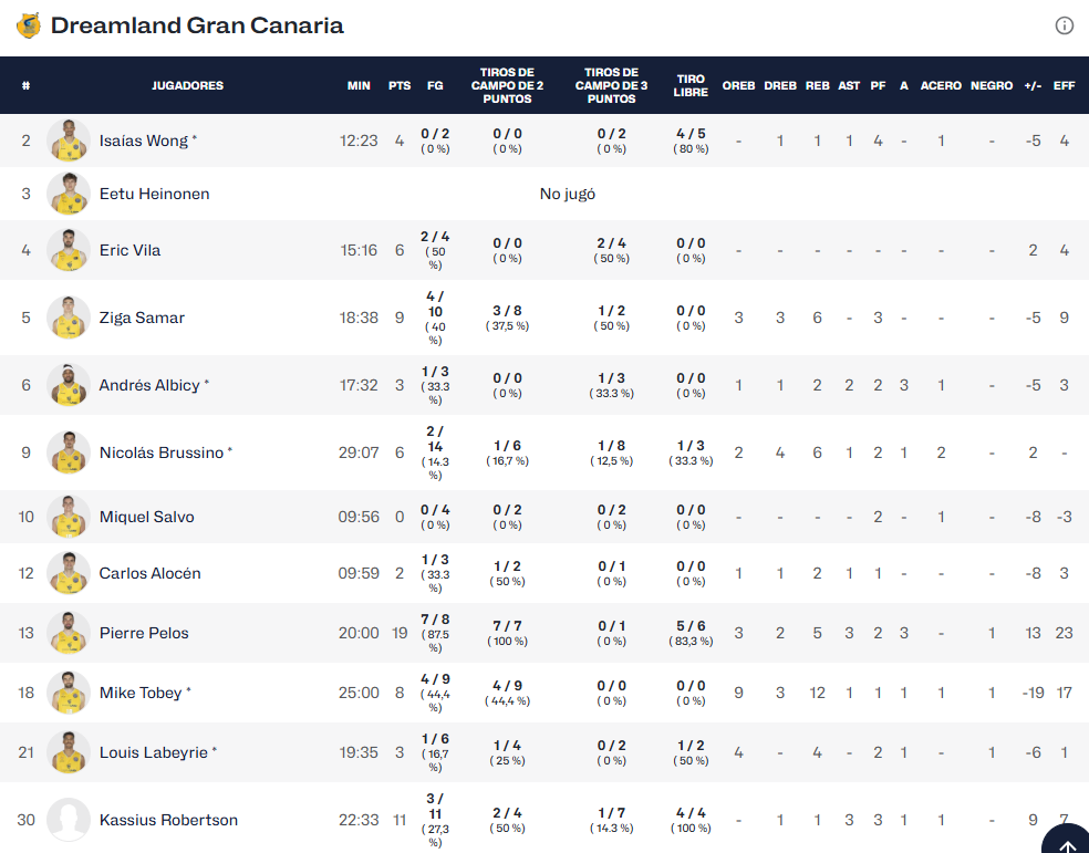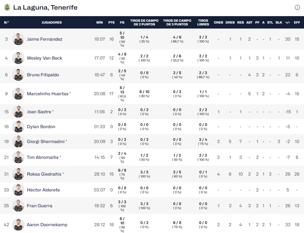 104 – La Laguna Tenerife (24+25+30+25). Huertas (17), Sastre (2), Gieidriatis (15), Abromaitis (7), Shermadini (3) -inicial-, Van Beck (12), Fitipaldo (8), Doornekamp (18), Guerra (6), Alderete (-), Bordón (-) y Fernández (16).