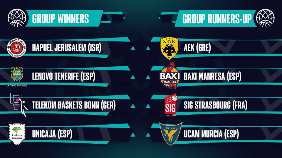 Los ganadores de grupo de los octavos de final son, en orden alfabético, Hapoel Bank Yahav Jerusalem (ISR); Lenovo Tenerife (ESP); Telekom Baskets Bonn (ALE) y Unicaja (ESP).