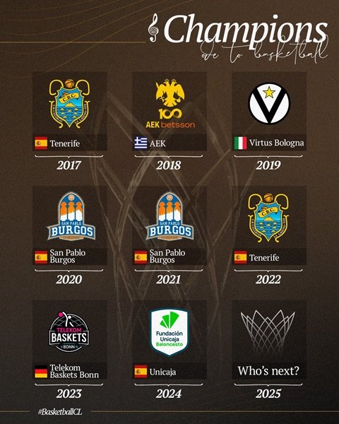 Los otros cuatro vencedores de la BCL han sido: AEK Atenas (2018), Virtus Bolonia (2019), Telekom Basket Bonn (2023) y Unicaja Málaga (2024).