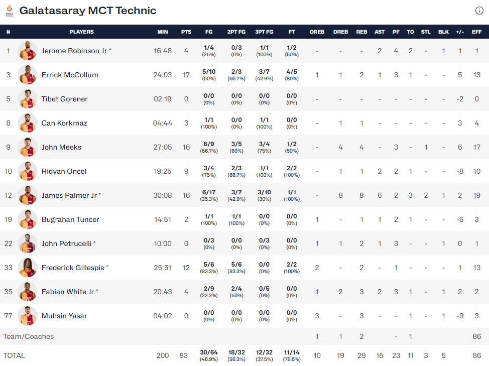 El Galatasaray no se rindió y creyó hasta el final en sus posibilidades, gracias a la calidad indudable de su plantilla, pero también por una concatenación de jugadas frustradas de los anfitriones, varias de ellas con el malestar del respetable por las decisiones arbitrales. Un par de triples consecutivos de McCollum y Robinson estiraron la agonía (84-83).
