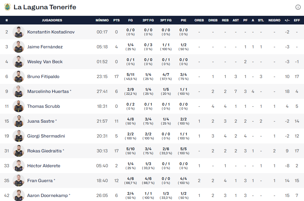 La Laguna Tenerife 80 (18+21+20+21). Huertas (6), Sastre (11), Giedriatis (17), Doornekamp (6), Guerra (12) –inicial-, Fernández (4), Kostadinov (-), Fitipaldo (17), Scrubb (-), Alderete (2), Van Deck (-) Shermadini (5).