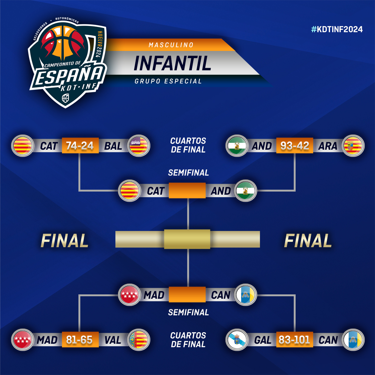 Andalucía impuso su físico ante Galicia, aunque tuvo que sentenciar en el último cuarto, con Daniel Carrasco (19 puntos). Cataluña se había mostrado muy dominante en la primera fase, pero Murcia consiguió parar su producción ofensiva sin llegar a dominar el rebote, pero llevando el partido a un marcador más ajustado. Por último la Comunitat Valencia superó a País Vasco con 24 puntos de Marc Grau y 20 de Javier Viguer.