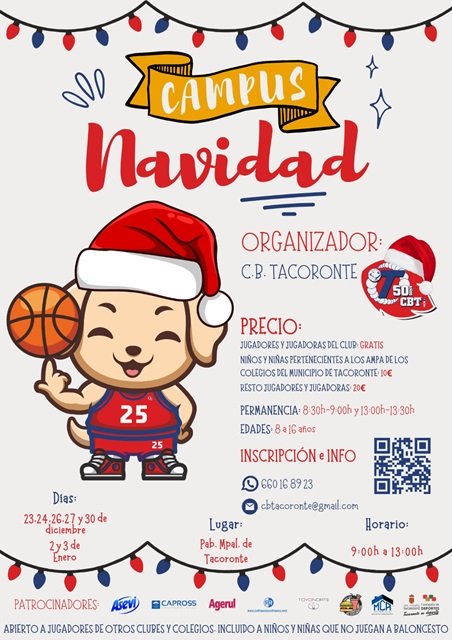 CB Tacoronte ¡Estas Navidades, el baloncesto no se detiene! El CB Tacoronte te invita a participar en nuestro Campus de Baloncesto de Navidad. Vive unas fiestas llenas de deporte, diversión y aprendizaje Fechas: 23, 24, 26, 27 y 30 de diciembre; 2 y 3 de enero Horario: De 9:00h a 13:00h (acogida desde las 8:30h y permanencia hasta 13:30h) Lugar: Pabellón Municipal de Tacoronte Precio: - Jugadores y jugadoras del club - GRATIS - Niños y niñas pertenecientes a los AMPA de los colegios del municipio de Tacoronte - 10€ - Resto de jugadores y jugadoras - 20€ Edades: De 8 a...