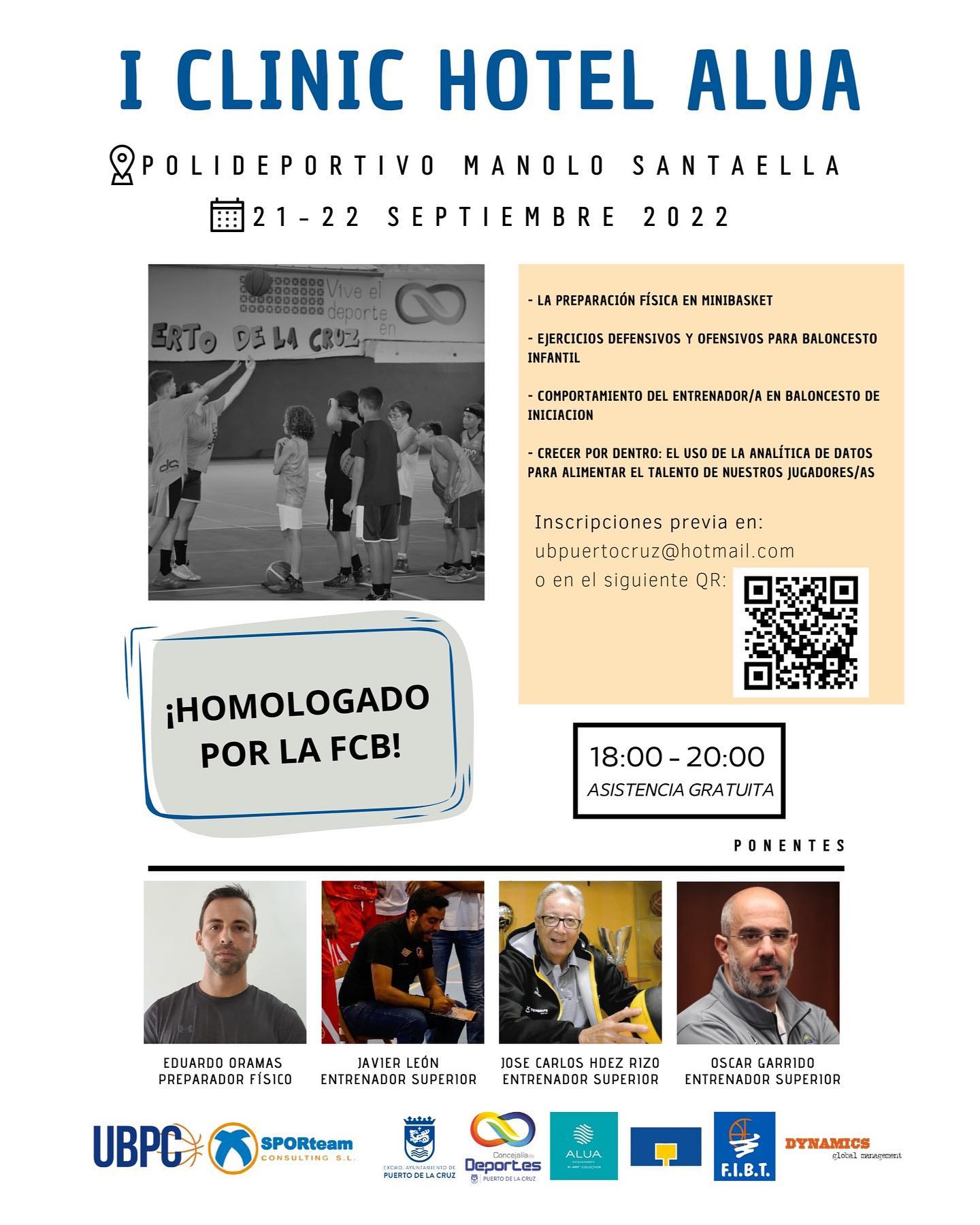 La directiva de la Unión Baloncesto Puerto Cruz hace oficial la celebración de la primera edición del CLINIC HOTEL ALUA. "Los días 21 y 22 de septiembre contaremos en nuestras canchas con Eduardo Oramas (Preparador Físico), Javier León (Entrenador Superior), José Carlo Hernández Rizo (Entrenador Superior) y Óscar Garrido (Entrenador Superior), ponentes de esta interesante cita cestista. Tendremos la oportunidad de poder escuchar y seguir formándonos en nuestro deporte. Es un clinic abierto a todos los entrenadores, monitores. Asistencia GRATUITA Formaliza la inscripción a través del email [email protected] El Hotel Alua está situado en las inmediaciones del Polideportivo Manolo Santaella y tiene ofertas especiales para deportistas....