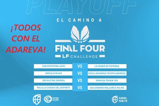 El Toyota Adareva recibe el sábado al Unicaja de Málaga en el "Islas Canarias" de Finca España Con el Innova-tsn Leganés coronado ya como campeón y la Liga Regular recién terminada, la LF Challenge iniciará este fin de semana unos exigentes Playoffs que han fijado ya sus fechar de juego y horarios de competición a la búsqueda de los cuatro billetes que darán opción a la disputa de la Final Four. Un apasionante camino hacia la segunda plaza de ascenso a una LF Endesa para la que no faltarán candidatos. ÁREA DE COMUNICACIÓN FEB Los Playoffs por el ascenso se pondrán en marcha...