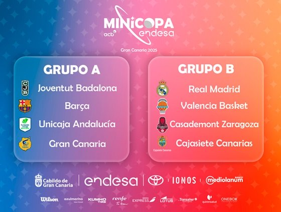 La Minicopa Endesa Gran Canaria 2025 define su camino Barça, Joventut Badalona, Unicaja Andalucía y Gran Canaria lucharán en el grupo A, mientras que Real Madrid, Valencia Basket, Casademont Zaragoza y Cajasiete Canarias medirán fuerzas en el grupo B Ya empieza a ser tradición. La Minicopa Endesa, que sigue creciendo cada año, volvió a ser protagonista del evento, realizándose el sorteo de grupos. En esta ocasión, los encargados de sacar las bolas de cada bombo fueron Ruymán Fernández y Trinidad Guerra, representando al Proyecto SUMA. La iniciativa, ganadora de Liga Endesa de Corazón, incentiva el baloncesto sin condiciones ni límites, acerca la práctica del deporte con...