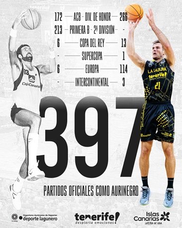 Un hito de otros tiempos. El ala pívot de La Laguna Tenerife, Tim Abromaitis, igualó este martes noche a Manolo de las Casas al frente del ranking de jugadores con más partidos oficiales de aurinegro entre todas las competiciones de ámbito nacional e internacional. Un registro de lo más meritorio vinculado a dos trayectorias grabadas en letras de otro en el imaginario canarista de todos los tiempos. PRENSA CB CANARIAS.- Ambos figuran ahora, con 397 encuentros, al frente de un listado de nombres ilustres, cuyo Top 5 completan a día de hoy Jaime Heras (369 choques), Aaron Doornekamp (365) y Marcelinho Huertas...