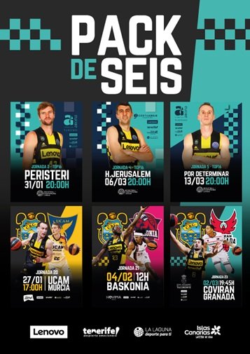 El Lenovo Tenerife activará a partir de este viernes, a las 10:00 horas, la venta del 'Pack de seis', una iniciativa que incluirá los seis próximos partidos que dispute el primer equipo aurinegro en el Santiago Martín después de este domingo. La promoción, válida hasta fin de existencias, inlcuirá los encuentros de Liga Endesa ante el UCAM Murcia (sábado 27 de enero, 17:00 hora insular), Baskonia (domingo 4 de febrero, 12:00) y Covirán Granada (sábado 2 de marzo, 19:45 ); así como los tres correspondientes al Top 16, ante el Peristeri (miércoles 31 de enero, 20:00), el Hapoel Jerusalem (miércoles 6...