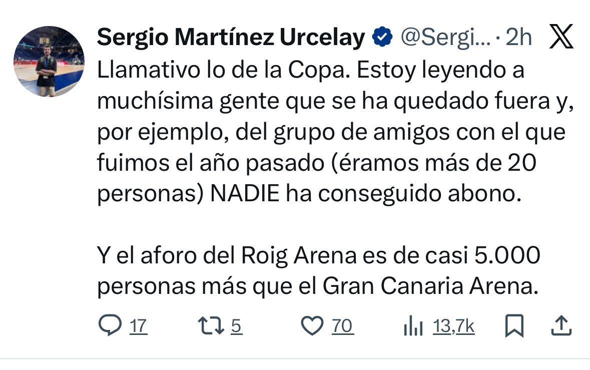Crees que eres tú el que has tenido mala suerte, pero comienzas a leer Twitter, Facebook, Instagram… y compruebas que son miles los aficionados al baloncesto, de todas las edades y de toda la España cestista que también se han quedado sin opciones de comprar su abono, como lo has hecho en las últimas ediciones de la Copa del Rey.