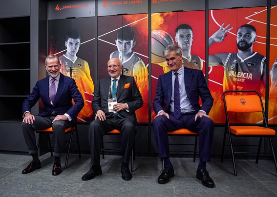 El Rey de ESPAÑA, Juan Roig, propietario del Valencia Basket y del «Roig Arena» y Antonio Martín, presidente de ACB