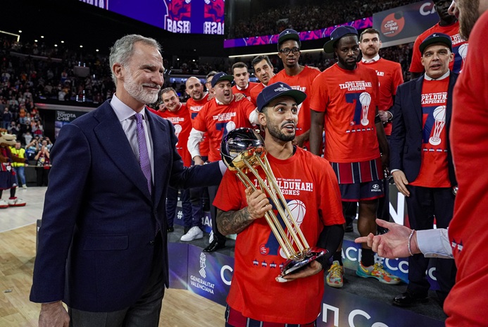 Forrest recibe el trofeo de MVP de manos de FELIPE VI, en presencia del presidente de la ACB