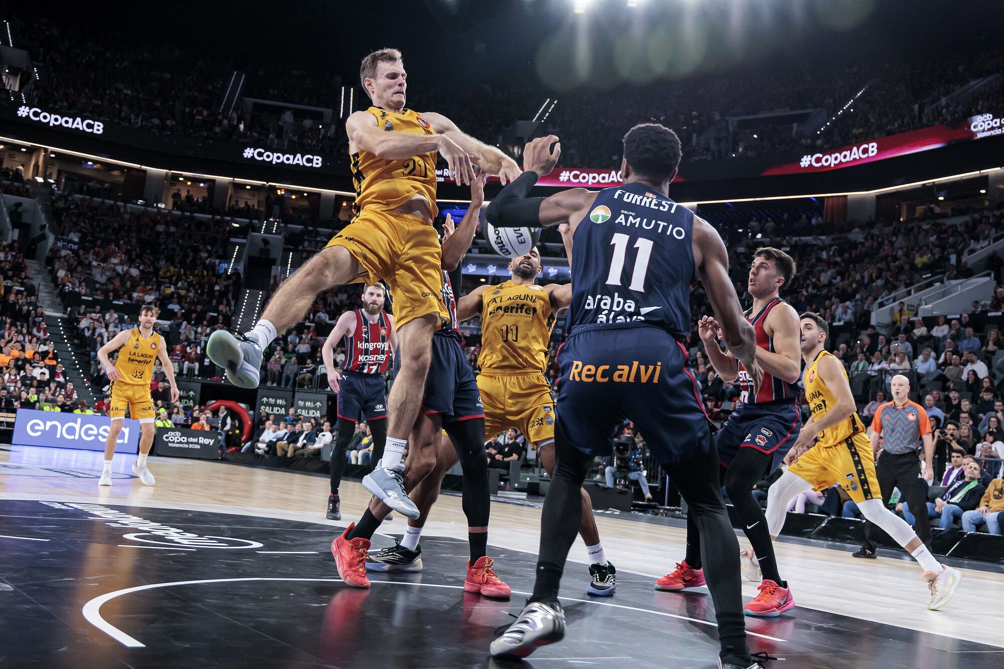 Lejos de rendirse, el equipo aurinegro minimizó daños con varias acciones de mérito de Rokas Giedraitis, el tercer triple de Bruno y dos libres de Gio Shermadini (42-33), pero el Baskonia volvía a hacer daño con un triple sobre la bocina de Rodion Kurucs para irse al descanso doce arriba (45-33).