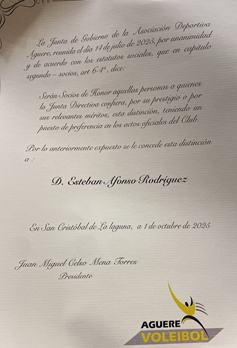 La Asociación Deportiva Aguere, presidida por Juan Miguel Mena, por acuerdo unánime de su junta directiva, acordó nombrar a ESTEBAN AFONSO RODRÍGUEZ socio de honor del CLUB VOLEIBOL AGUERE.