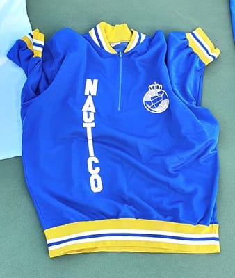 Coco Morales, componente del Veterano +45 y directivo de la Sección, había pedido a sus compañeros de equipo la posibilidad de llevar camisetas de épocas anteriores del Náutico y sorprendieron con las ocho de la foto, algunas con casi 40 años de historia.